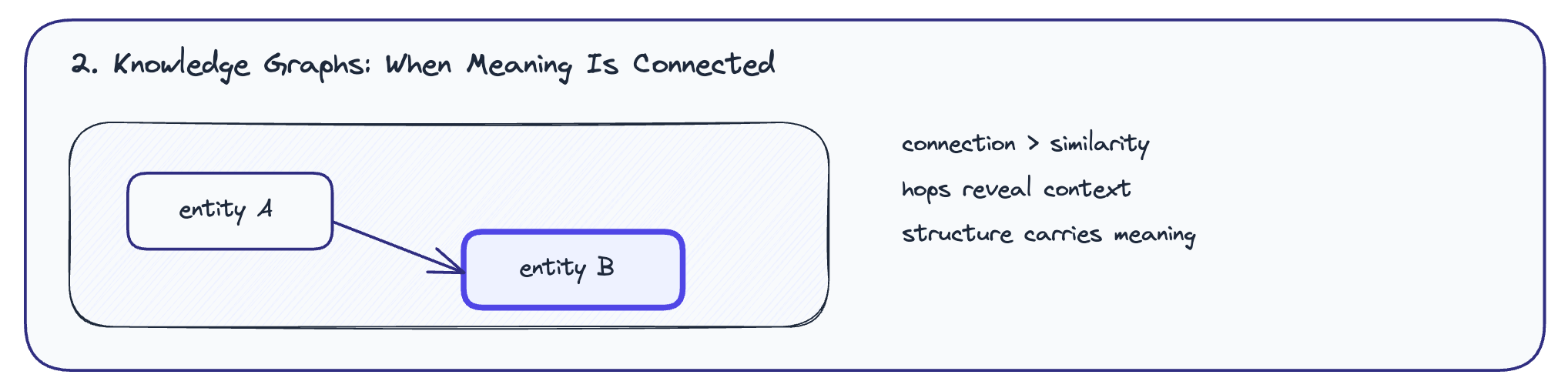 A knowledge graph doesn’t care if two things sound alike. It cares about how they’re connected. Entities are nodes. Relationships are edges. Meaning emerges from how many “hops” it takes to get from one thing to another.